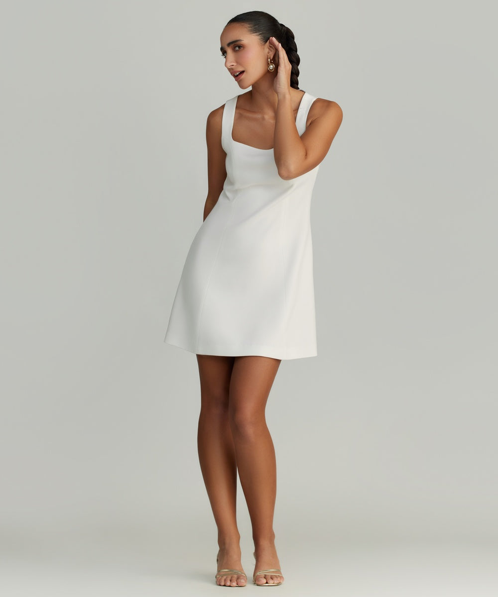 • Stretch suiting mini dress in pearl with light pink contrast colour lining