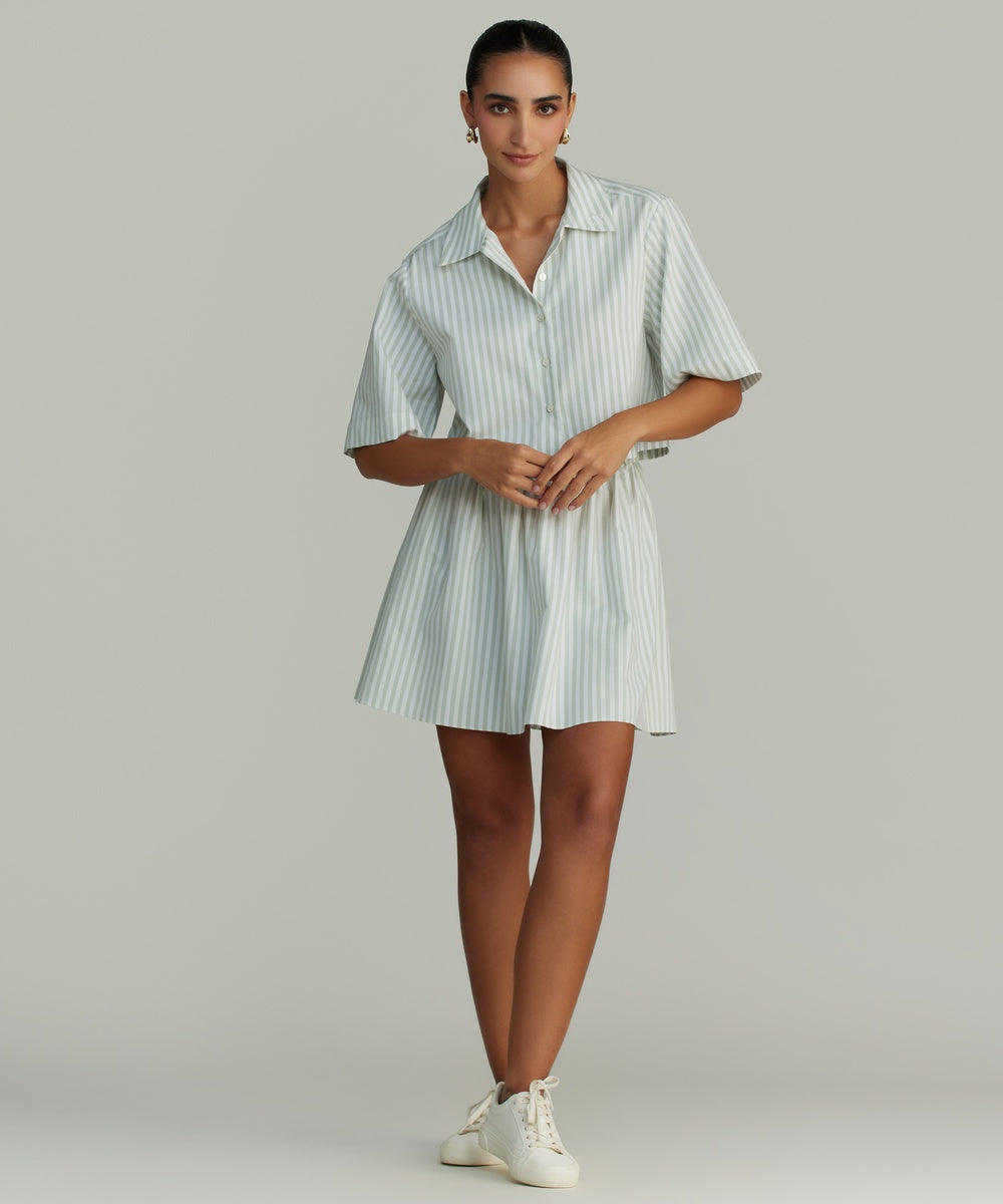 Pistachio Striped Cotton Tencel Cropped Bowling Shirt